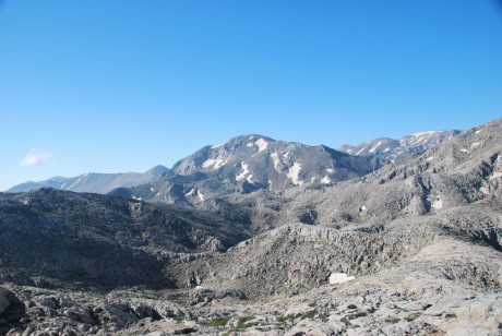 Agio Pneuma ráno - pohledu tímto směrem vévodí. Vlevo od masivu Agio Pneuma vykukuje špička kužele Askifiotiko Soros, vpravo špička jiného kužele - Grias Soros a dále vpravo Svourichti