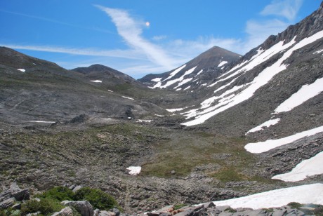Pohled ze sedla od závětří na druhou stranu. Tímto údolím jde E4 směrem ke Kástru/planině Niátos až do dalšího sedla (2080 m) vlevo od kuželovité hory (Grias Soros). Na planince hned dole dobrá možnost bivaku.