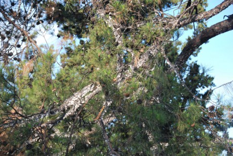 Borovice zde jsou ale bohužel napadeny nějakou mšicí, která hlavně na větvích vytváří bílé chomáče jakoby voskovité hmoty. Nasadili to sem místní producenti medu, ronící stromy poskytují sice včelám víc pro med, ale stromy samy pomalu hynou...smutné...