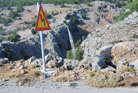 "Mořská cibule" dovede vyrazit i skrz asfalt. Za silnicí dole rokle Aradhéna s kouskem staré kalderimi, cesty, která před stavbou mostu byla jedinou spojnicí mezi částmi planiny