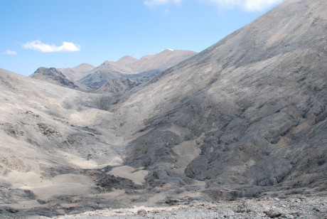 Závěr jiné divoké oblasti u druhé strany hory Askifiotiko Soros - Pavlia Charlara, tudy půjdeme. Zpočátku traverz nad úpatím svahu vpravo (hora Grias Soros)