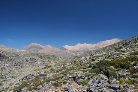 Tak tam někde jsme byli, v srdci Levka Ori. Ten světlý hřeben je před masívem s nejvyšší horou Levka Ori - Páchnes