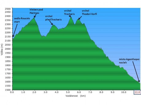 Výstup z Rousiés na hřeben pod finální částí výstupu na Páchnes, odtud sestup do údolí jižně a výstup na Trocharis a Thodorí Korfí, sestup údolím Choráfas Korfí na anopolskou silnici, přenocovat na Angathopoi, kde ze silnice odbočuje stará kalderimi