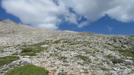 A teď doprava nahoru na hřeben, cesta se vine cik cak svahem, není zcela jasná, místy značky na skalách a velkých kamenech, mužíci a šedé tyče, které moc dobře vidět nejsou (žlutočená barva je z nich už oprýskaná)