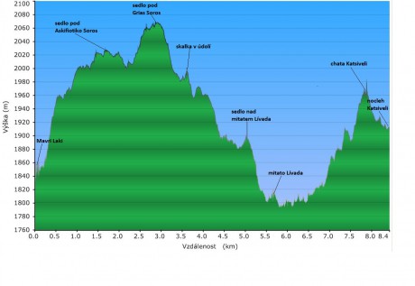 Profil dalšího dne přes sedla pod Askifiotiko Soros a dalším pod Grias Soros, a potom přes okraj planiny Lívada a kolem chaty Katsiveli dolů na stejnojmennou planinu