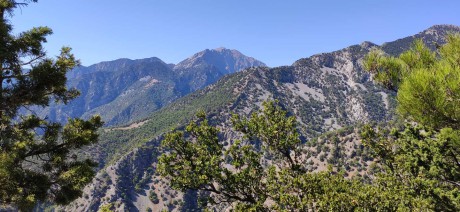 I na druhou stranu, do hor, je to skvělý pohled. Za hřebenem v popředí, který odděluje rokle Samária a Eligias, vykukuje masív hory Volakias (2114 m), jehož bližší konec je tvořený ostrou horou Psiristra (asi kolem 1700 m)