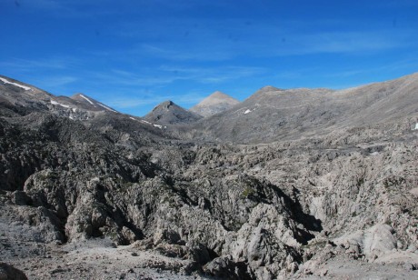 Klasický pohled přes oblast Pavlia Charlara. Tmavý vrchol je Pavliana (2065 m), vyšší za ním je Askifiotiko Soros (2190 m), vedle něj vpravo Ghoniasmatha (2015 m; dál doprava pak hřeben s Kakovoli). Vlevo od Pavliana kouká vrchol Grias Soros (2310 m)