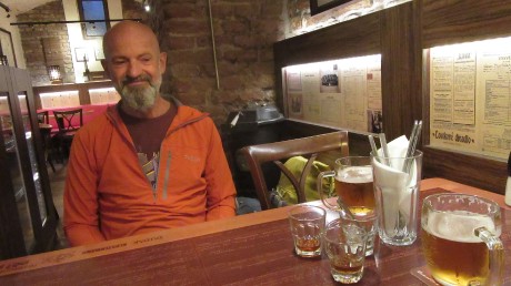 ... a večer už v hospodě Pět peněz u hodně (barevně) podobného stolu, jako byl ráno ten na autobusáku v Chanii. A pak jsme se najedli a rozešli se bydlet každý do svého. Takže letošní konec. :-( No a přístí rok? Žeby Azory? No, uvidíme...