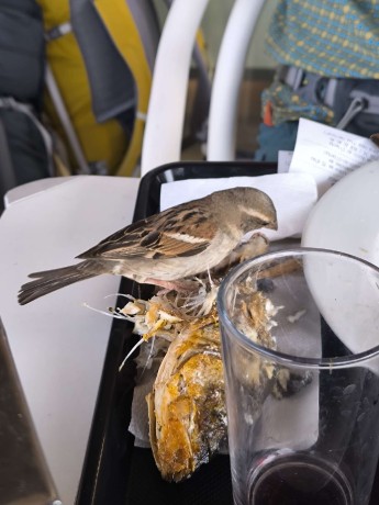 Když jsme odcházeli na letiště, tak jsme se na oběd zastavili v sámošce Pingo Dolce, má jídelní koutek. Kamarád si dal rybku a na její už obranou kostřičku na kraji talíře se hned vrhly vrabcové (byly to výhradně samičky). Dost voprsklý...