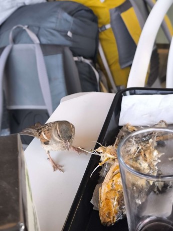 Když jsme odcházeli na letiště, tak jsme se na oběd zastavili v sámošce Pingo Dolce, má jídelní koutek. Kamarád si dal rybku a na její už obranou kostřičku na kraji talíře se hned vrhly vrabcové (byly to výhradně samičky). Dost voprsklý...
