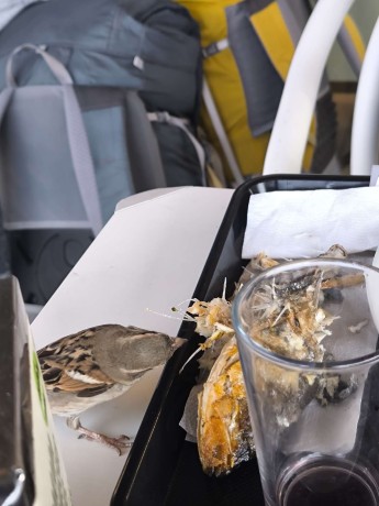 Když jsme odcházeli na letiště, tak jsme se na oběd zastavili v sámošce Pingo Dolce, má jídelní koutek. Kamarád si dal rybku a na její už obranou kostřičku na kraji talíře se hned vrhly vrabcové (byly to výhradně samičky). Dost voprsklý...